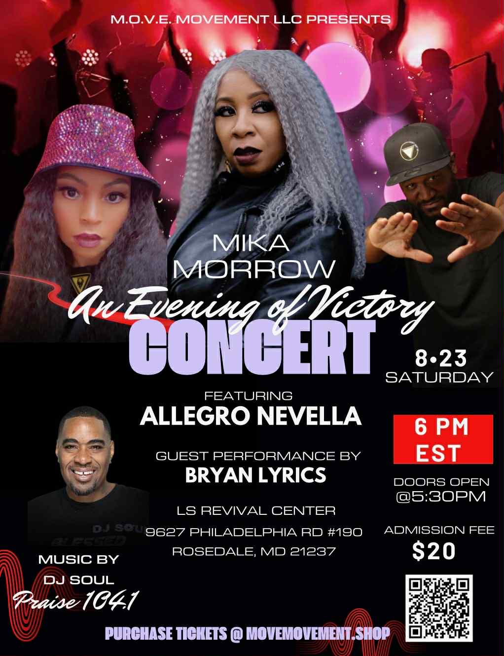 Get ready for an unforgettable night of worship, healing, and breakthrough with Mika Morrow! Featuring electrifying performances by Allegro Nevella and Bryan Lyrics — you don’t want to miss it!"